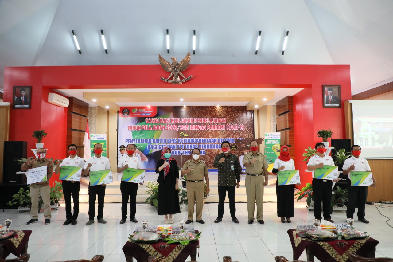 BLITAR KAB – Bupati Blitar lakukan sosialisasi kebijakan pembelajaran tahun pelajaran 2020/2021 dimasa pandemi Covid-19 dan pemberian secara simbolis BPJS Ketenagakerjaan kepada PTT dan GTT. Acara dilaksanakan di Aula Garuda Dinas Pendidikan Kabupaten Blitar. Diikuti secara daring oleh tenaga pendidik pada hari Selasa (15/09/2020) bersama dengan Kepala Dinas Pendidikan dan Kepala BPJS Kabupaten Blitar .