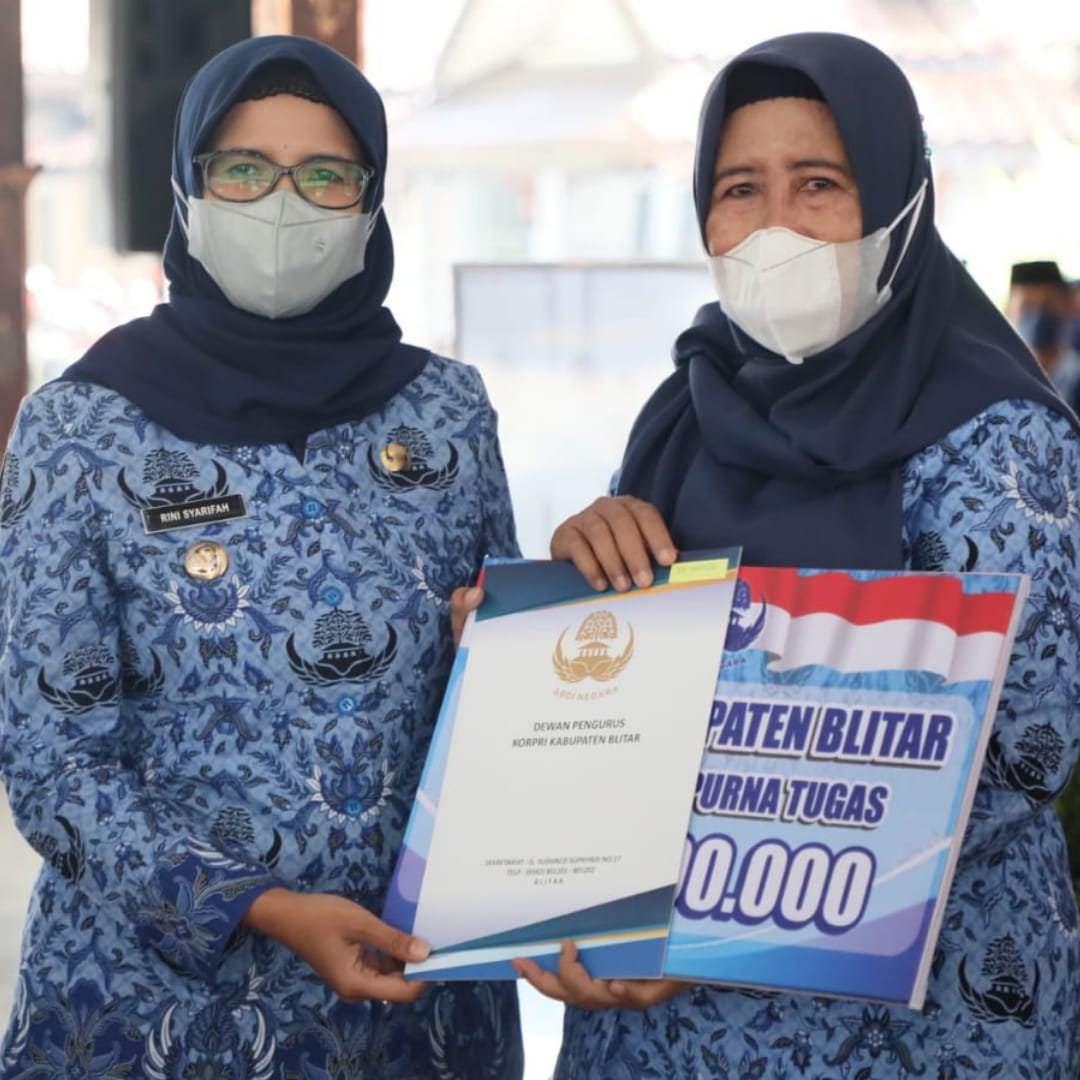 Selain itu, Mak Rini didampingi Sekda Kabupaten Blitar memberikan tali asih bagi anggota Korpri yang memasuki purna tugas. “Saya mengucapkan selamat memasuki masa Purna Tugas kepada 74 anggota KORPRI, semoga masa purna tugas ini dapat dinikmati dengan penuh kebahagian dan suka cita. Atas nama Pemerintah Kabupaten Blitar saya menyampaikan terima kasih atas pengabdian Bapak dan Ibu. Doa dan harapan kami semua, bapak dan ibu yang purna tugas tetap sehat, semangat dan bahagia,”harapnya.